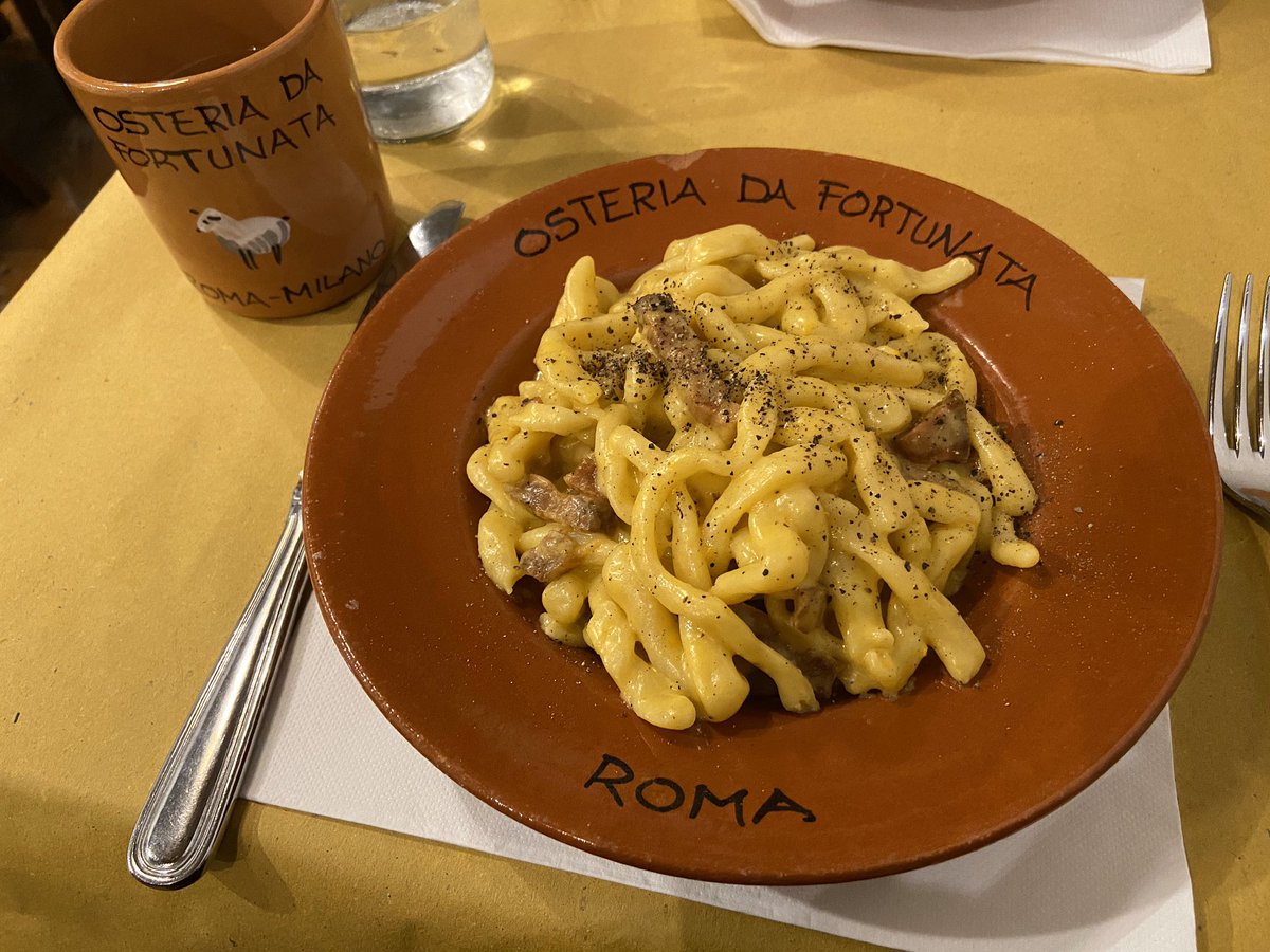 Com pratos de massa por 13 euros no cardápio, o destaque da casa é o gnochi feito de forma artesanal pela proprietária. A massa e feita ao vivo pela própria Fortunata, o que deixa a experiência ainda mais especial e imperdível em Roma.